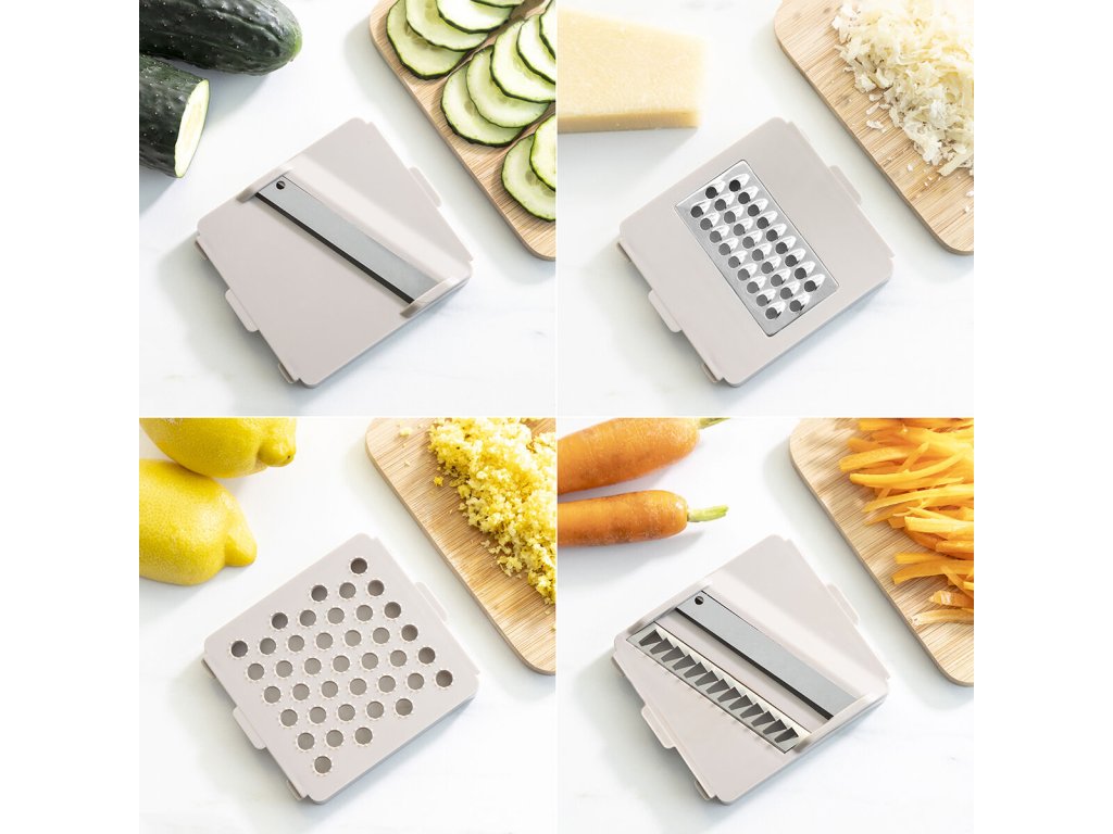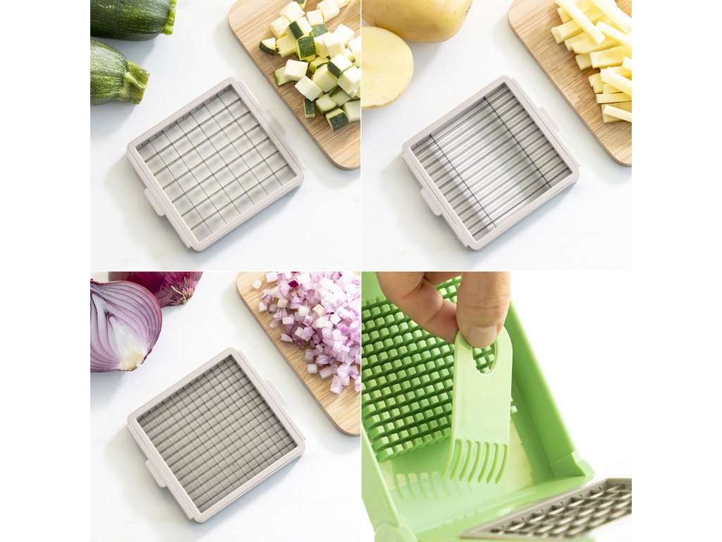 Vyměnitelné čepele: Součástí balení jsou vyměnitelné čepele pro různé typy řezů, které umožňují přesné a rovnoměrné krájení jedním pohybem.