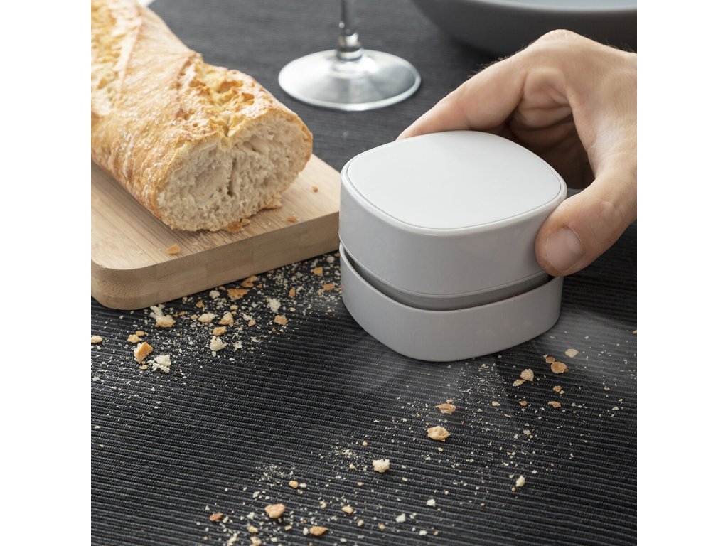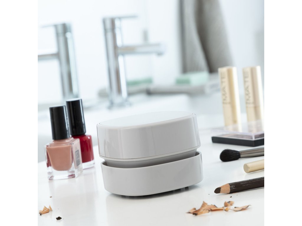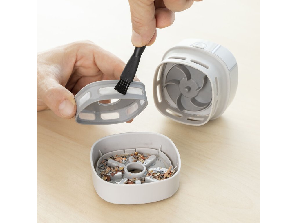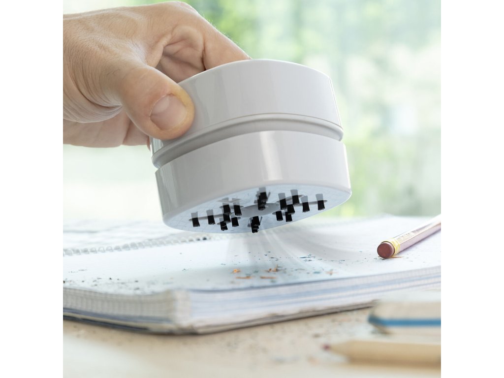 Na spodní straně vysavače se nacházejí malé kartáčky, které usnadňují sběr nečistot. Díky svému diskrétnímu a kompaktnímu designu může být umístěn na stole jako stylový doplněk. Je ideální pro vysávání různých materiálů, jako jsou gumové zbytky, kousky papíru, prach z klávesnice, drobky, popel či chlupy domácích zvířat.