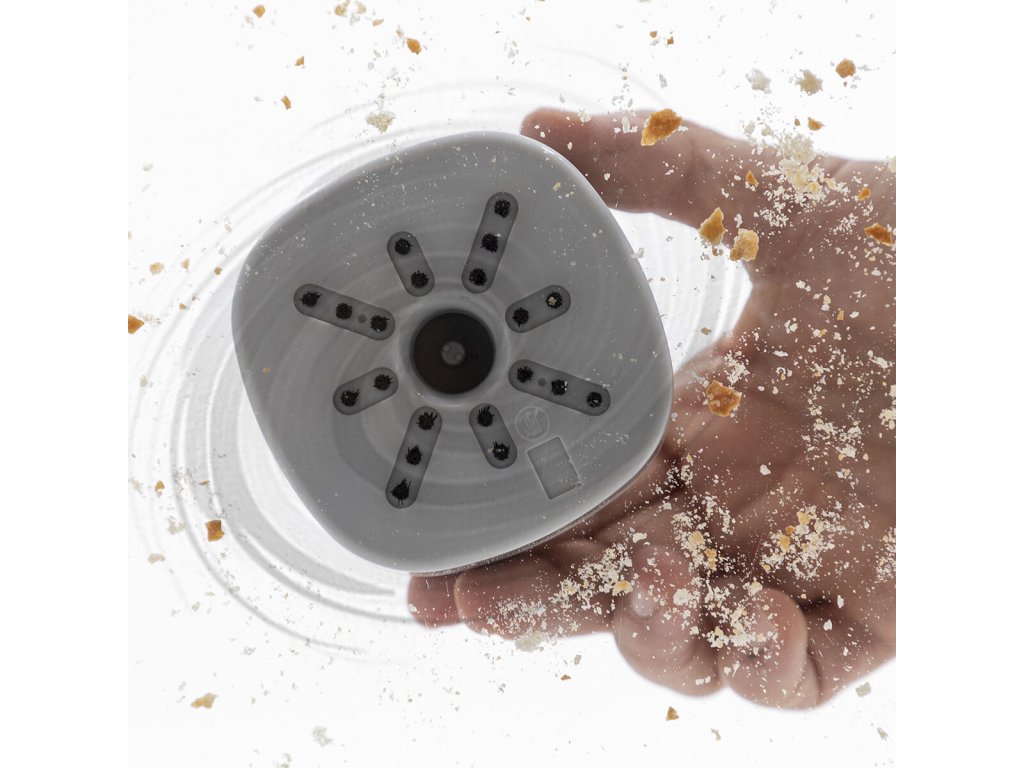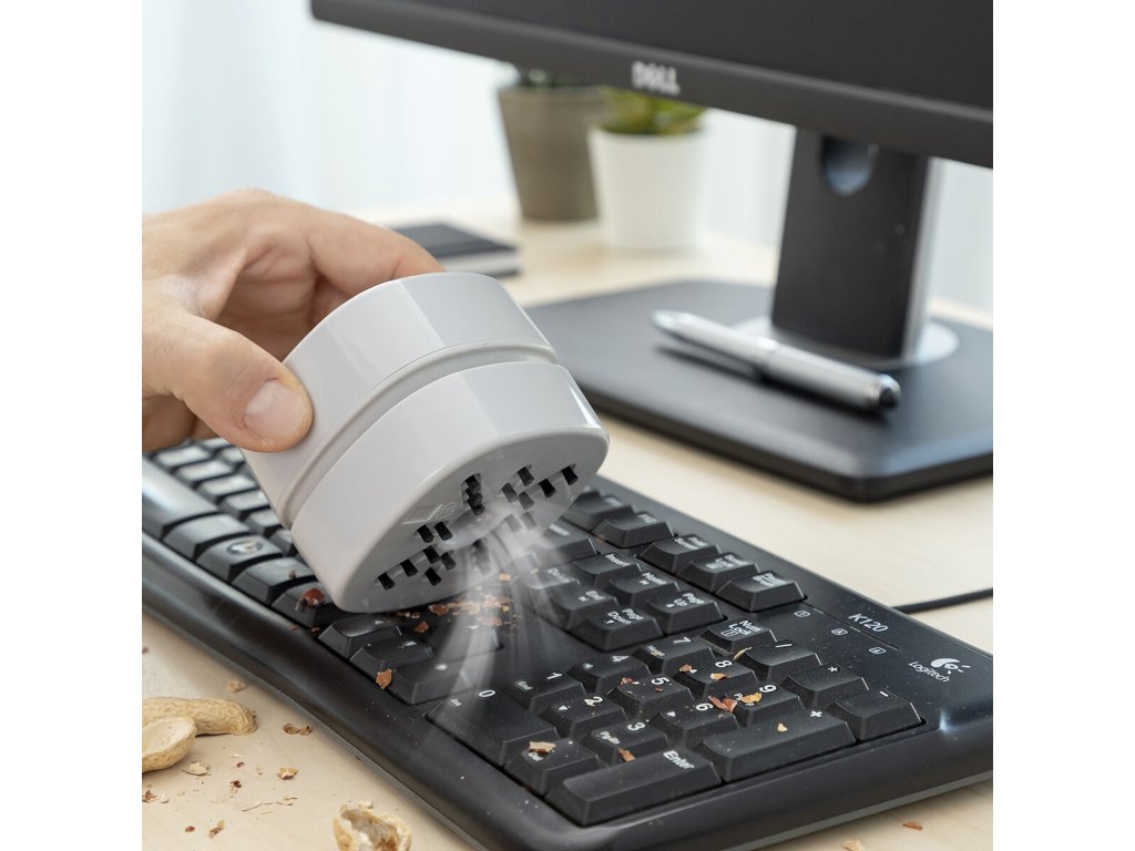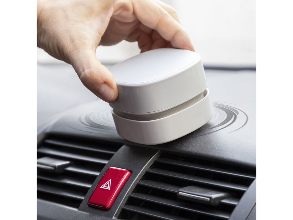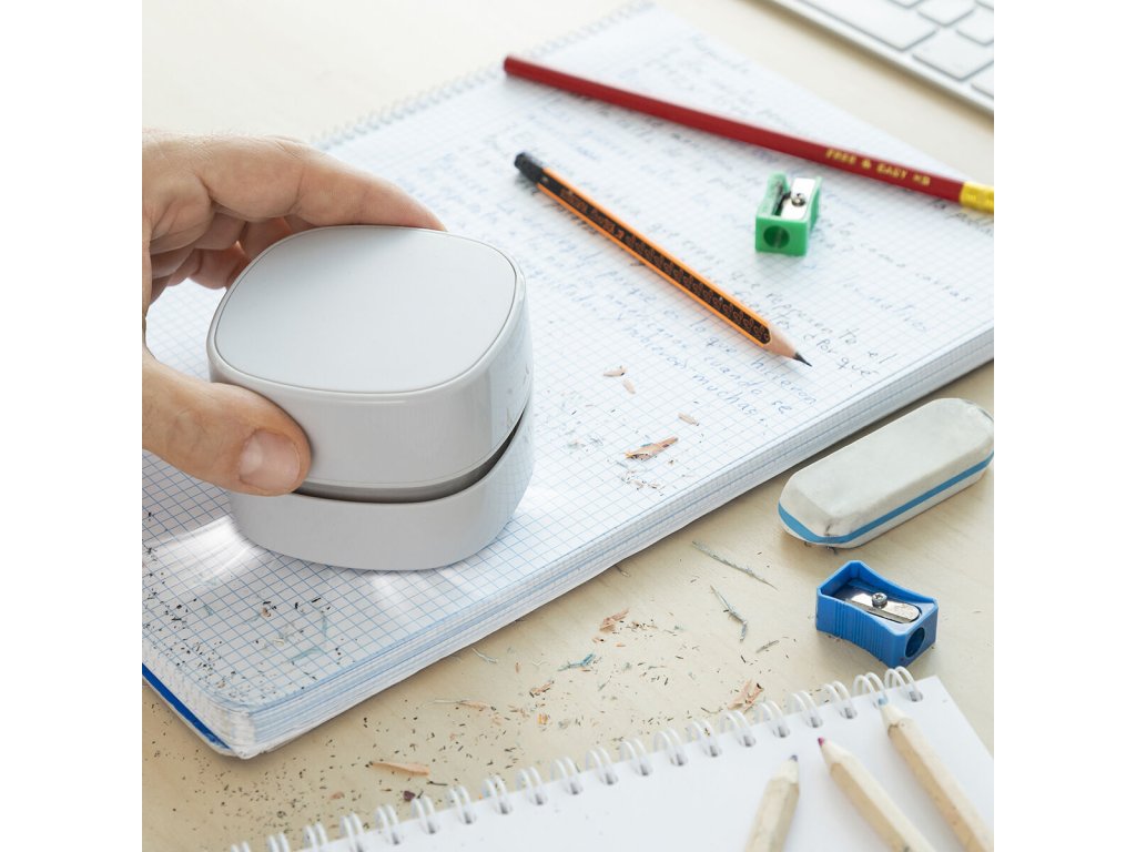 Na spodní straně vysavače se nacházejí malé kartáčky, které usnadňují sběr nečistot. Díky svému diskrétnímu a kompaktnímu designu může být umístěn na stole jako stylový doplněk. Je ideální pro vysávání různých materiálů, jako jsou gumové zbytky, kousky papíru, prach z klávesnice, drobky, popel či chlupy domácích zvířat.
