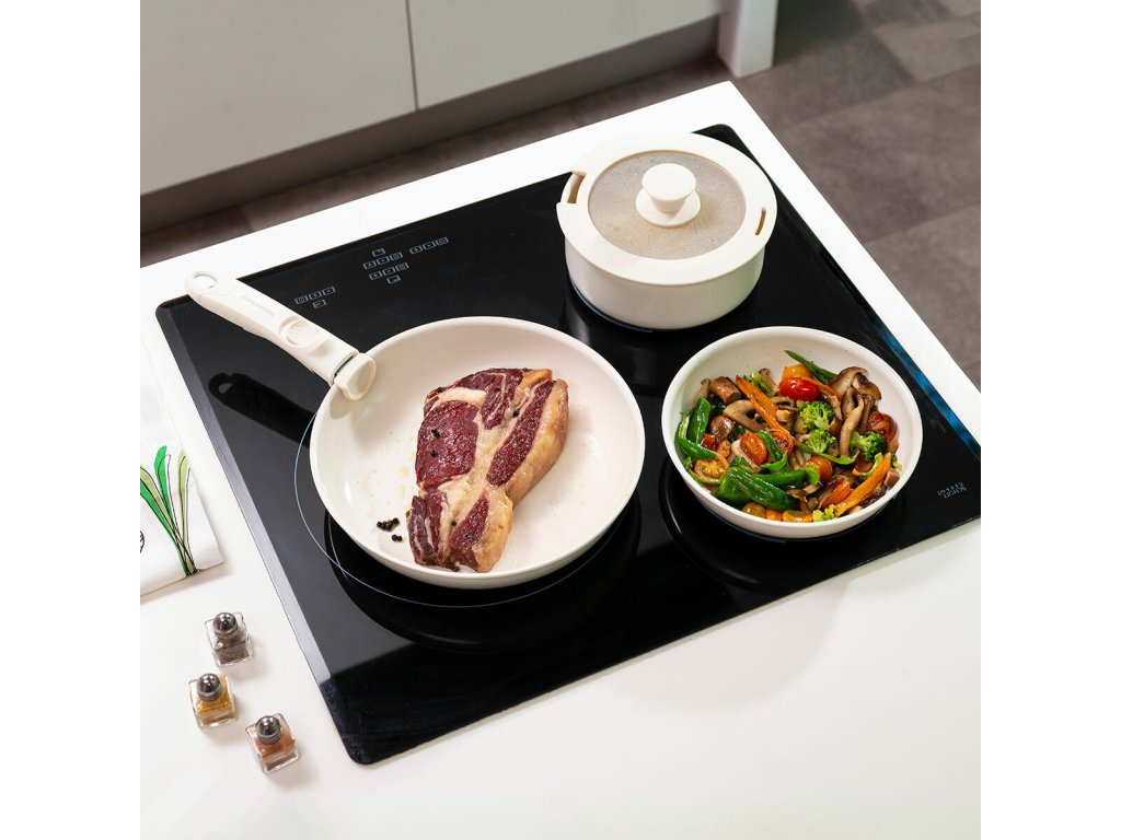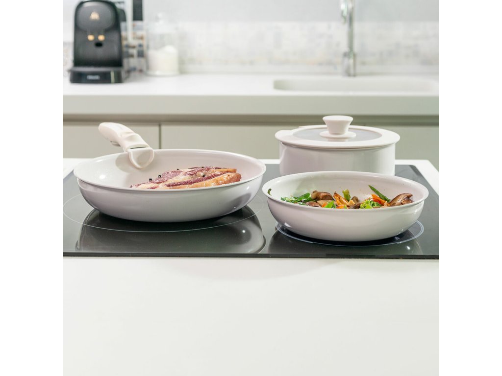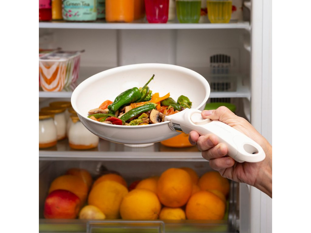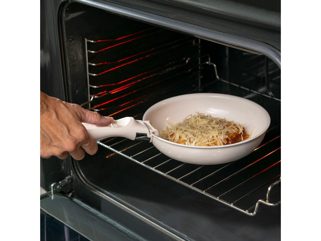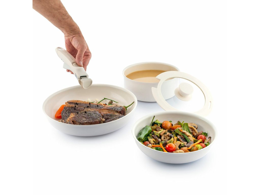 - Skladnost, odnímatelná rukojeť: s naší sadou nepřilnavých pánví, které můžete vkládat jednu do druhé, snadněji udržíte v kuchyni pořádek a ušetříte prostor. Vyměnitelnou rukojeť lze odejmout a uchovávat samostatně, aby zabrala méně místa ve skříňkách, zásuvkách apod.