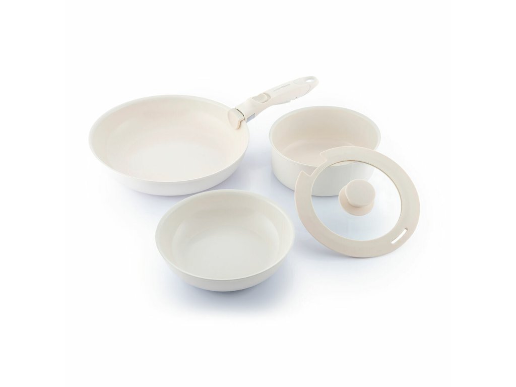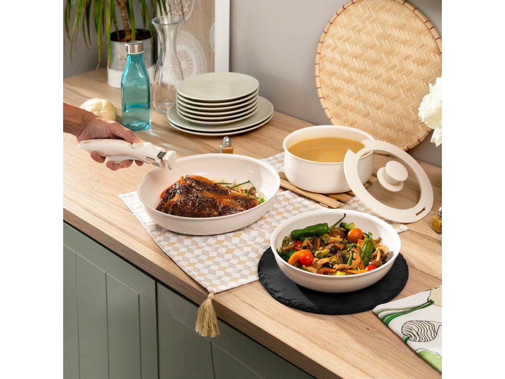 - Moderní design, 5 kusů: naše sada pánví s odnímatelnou rukojetí obsahuje 2 pánve (Ø 26 a 20 cm), rendlík (Ø 18 cm), skleněnou poklici se silikonovým okrajem (Ø 18 cm) a odnímatelnou rukojeť k výměně. Kompletní sada pánví krémové barvy, ideální doplněk do nejmodernějších praktických kuchyní.