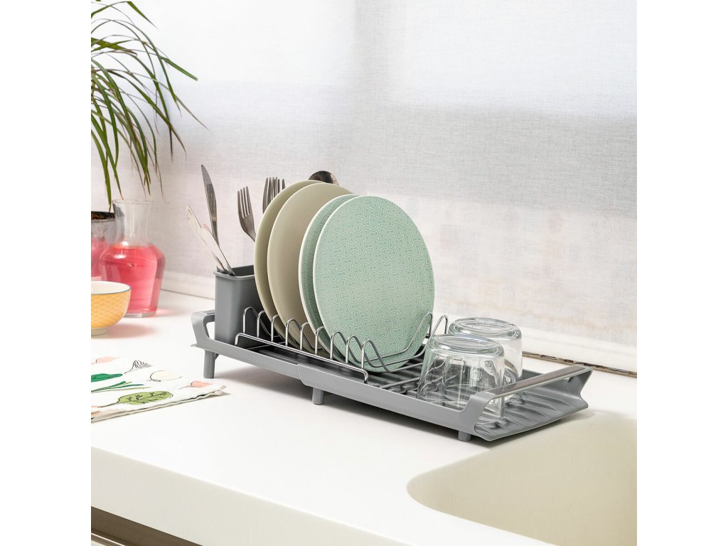 Odkapávač je vybaven sklonem, který zajišťuje efektivní odtok vody, čímž se minimalizuje její hromadění a urychluje proces sušení. Protiskluzové nožičky zajišťují stabilitu a bezpečné umístění na dřezu nebo kuchyňské pracovní desce. Součástí odkapávače je také odnímatelný koš na příbory, který usnadňuje organizaci a sušení menších kuchyňských potřeb.